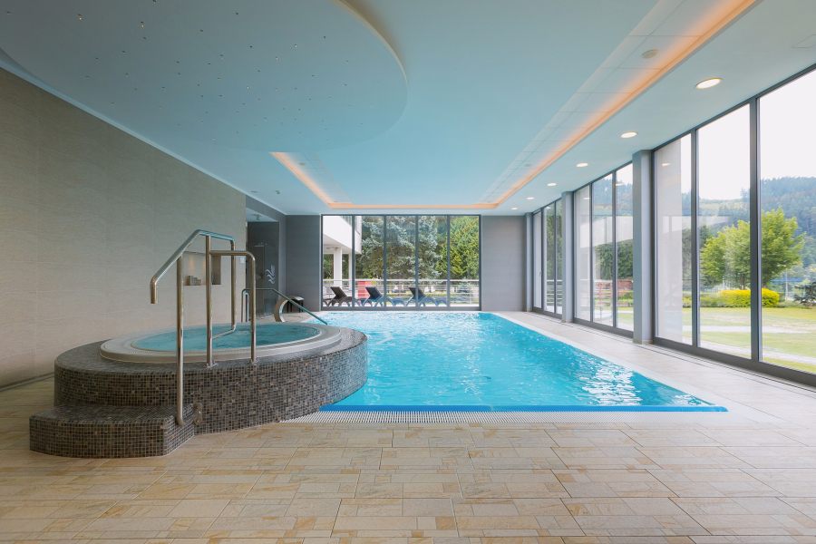 - wejście do dwupoziomowego centrum wellness z basenem